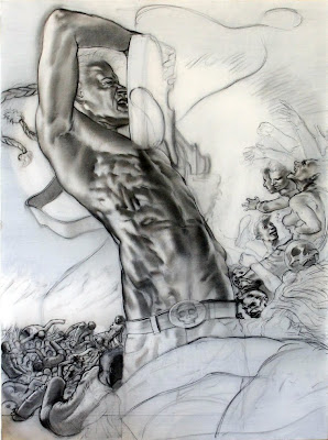 then you can see some steps in the process: from the sketch in charcoal and acrylic on canvas to the more precise drawing with conte' pencils, and also a digital passage in order to obtain an accurate foreshortening of the electric guitar (i used Maya in this case) .